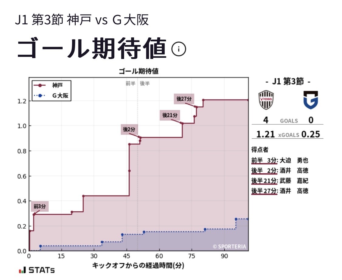 ◆悲報◆G大阪、神戸戦ゴール期待値わずか0.25、被ゴール期待値1.21で4失点…豆腐守備😭