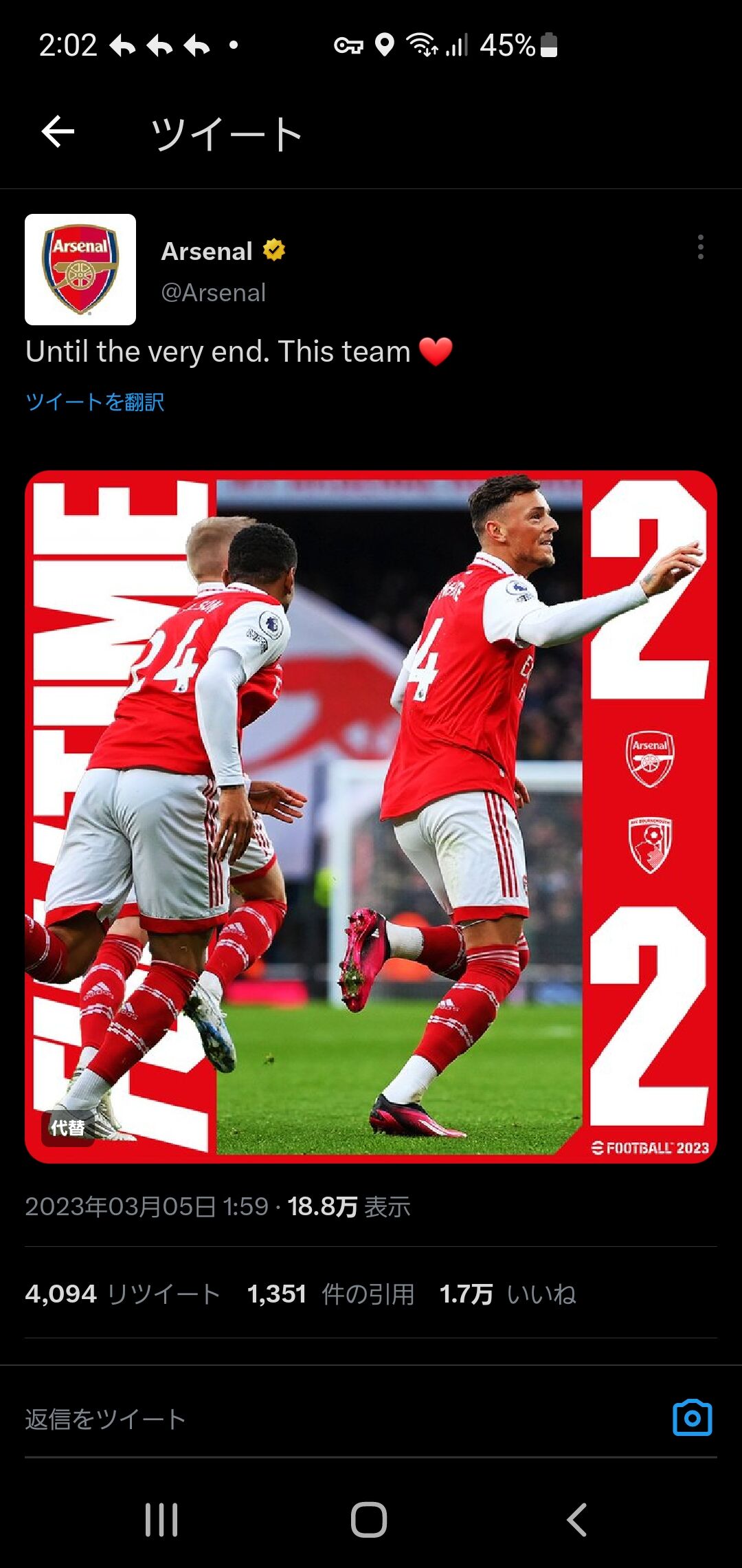 アーセナル公式2-2でツイートしてて草