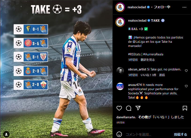 ◆リーガ◆レアル・ソシエダ公式さん、久保がゴールしたら全勝に気づいてしまう