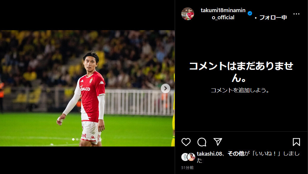 ◆朗報◆モナコFW南野タキ、3戦連続速攻でインスタ更新!コメントはまだない