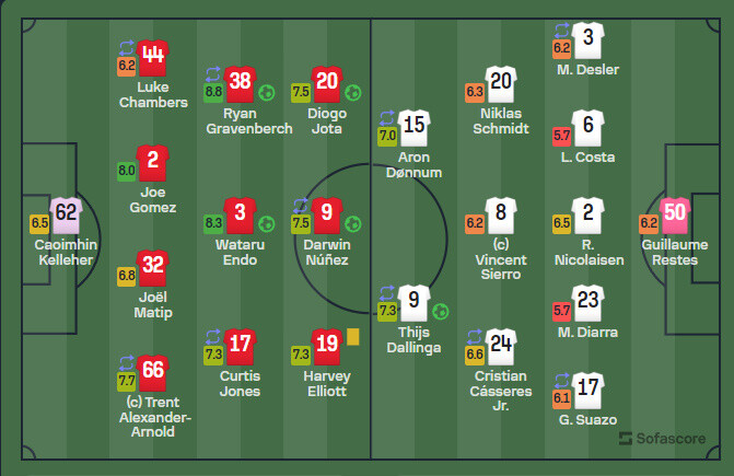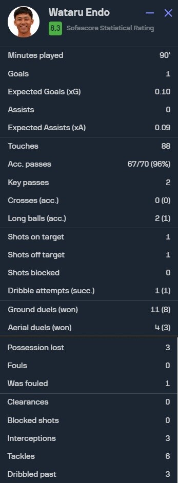 ◆UEL◆トゥールーズ戦リバポMF遠藤航8.3で両チーム2位、1Gパス96%デュエル11/15タックル6