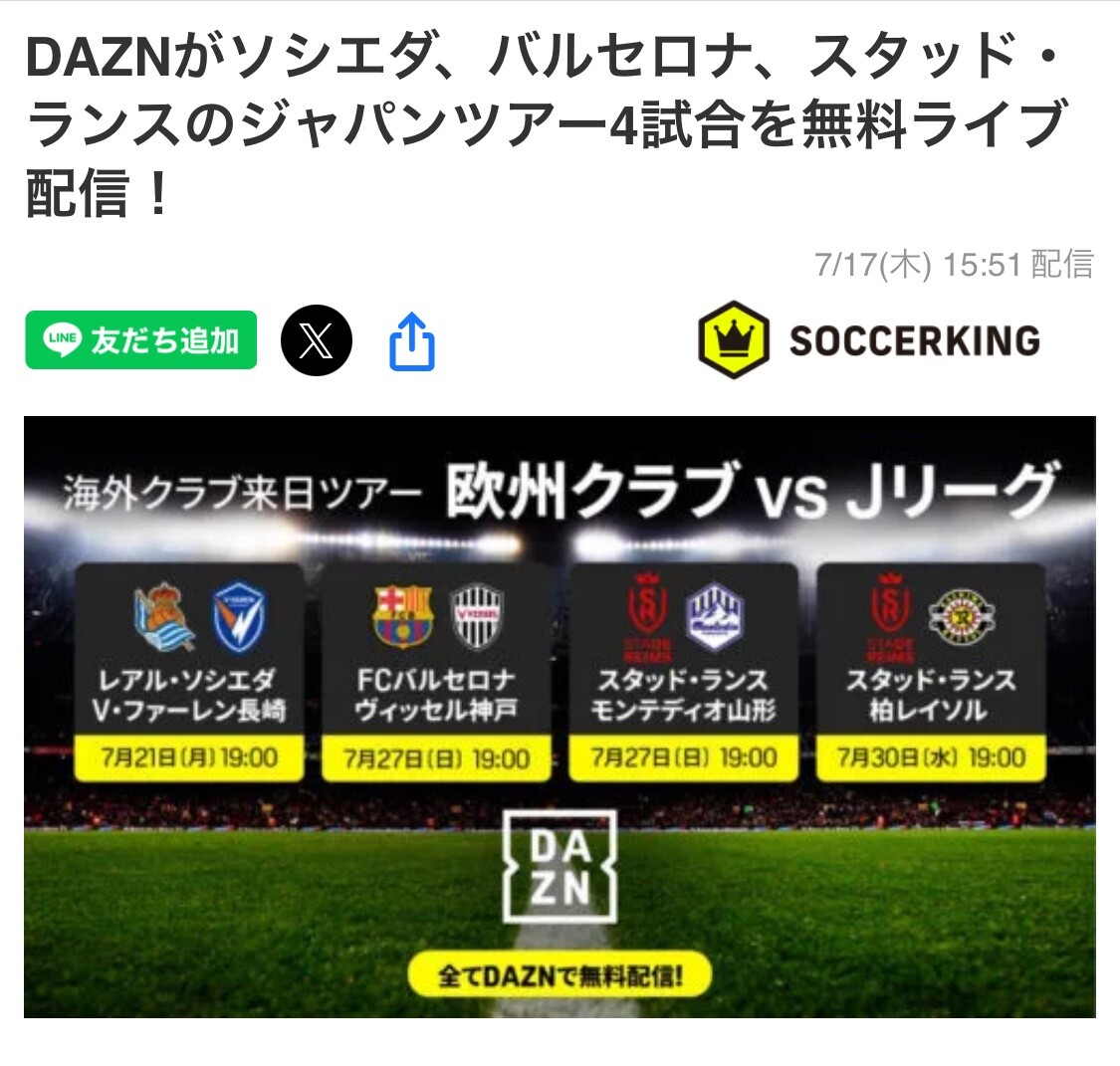◆朗報◆DAZN、ソシエダ・バルサ・ランスのジャパンツアーの試合を無料配信決定!