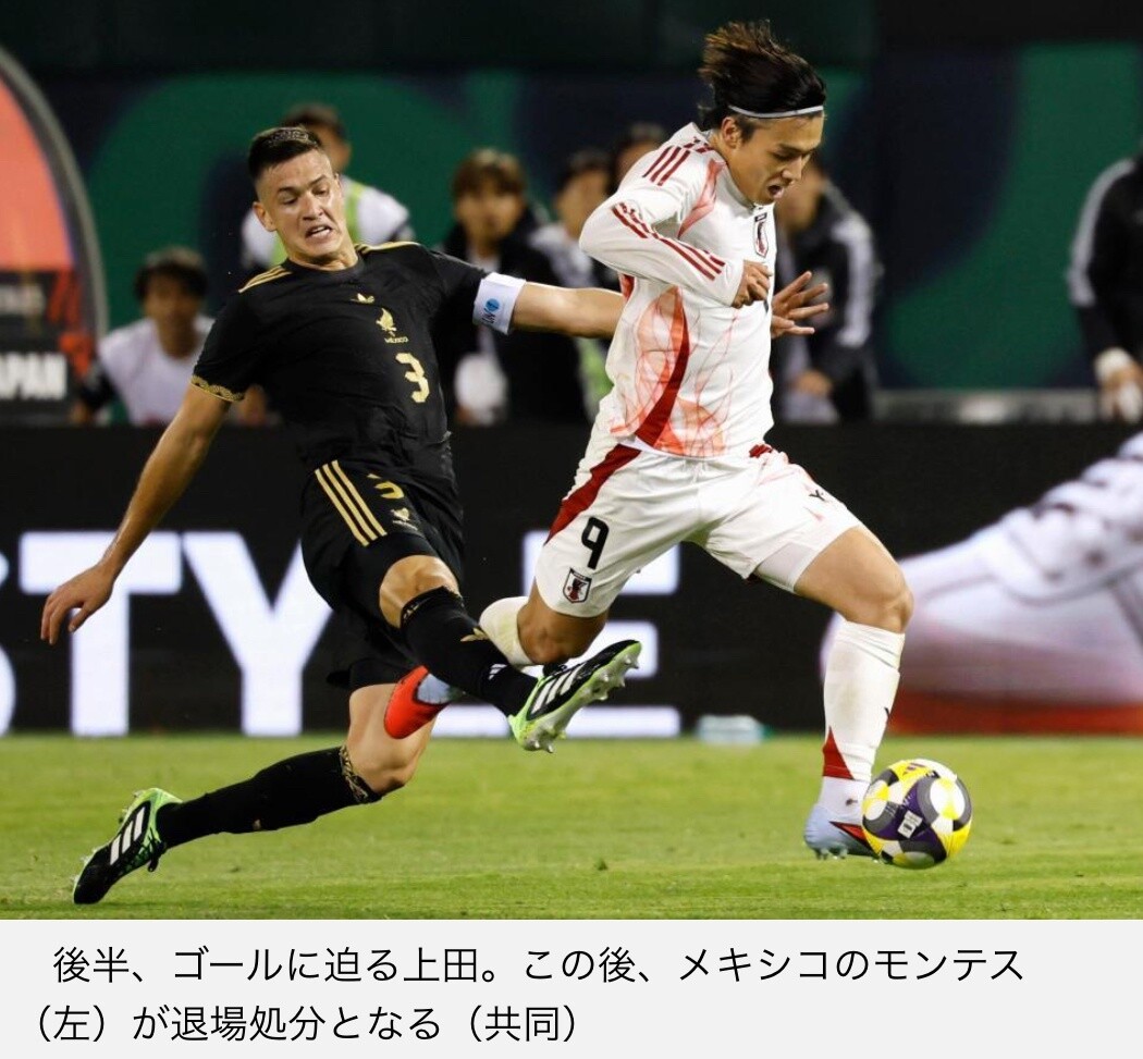 問題のシーンは後半45分ゴール前に完全に抜け出したFW上田綺世がメキシコのDFモンテスに後ろから右足を蹴られて倒された。明らかな決定機阻止で、レッドカードかと思われたが主審はイエローカードを提示した。