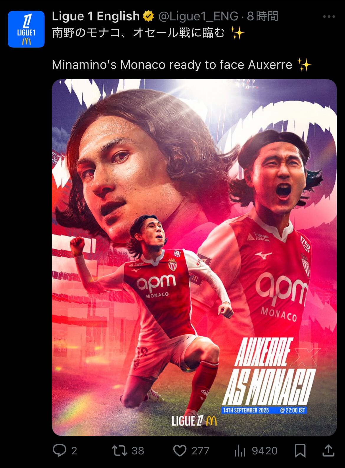◆悲報◆南野タキ、ASモナコ公式だけじゃなくリーグ・アン公式にも遊ばれてしまう🤔
