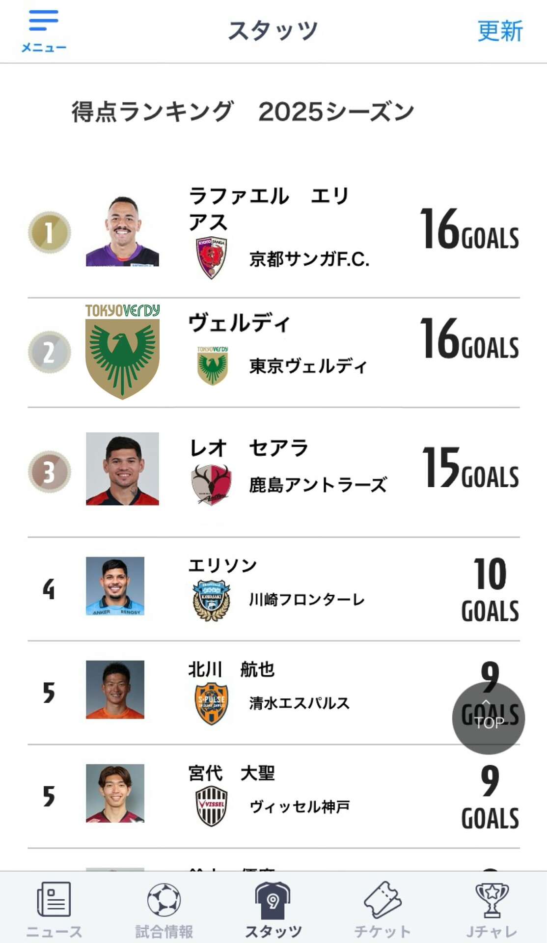 ◆J小ネタ◆J1得点ランク、1位エリアス16G、同点1位東京ヴェルディ16G、3位レオ・セアラ15G🤔