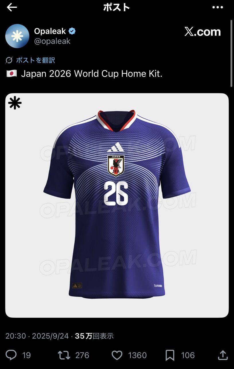 【画像】日本代表の新ユニフォームが流出!? W杯2026はこのデザインで臨む模様…