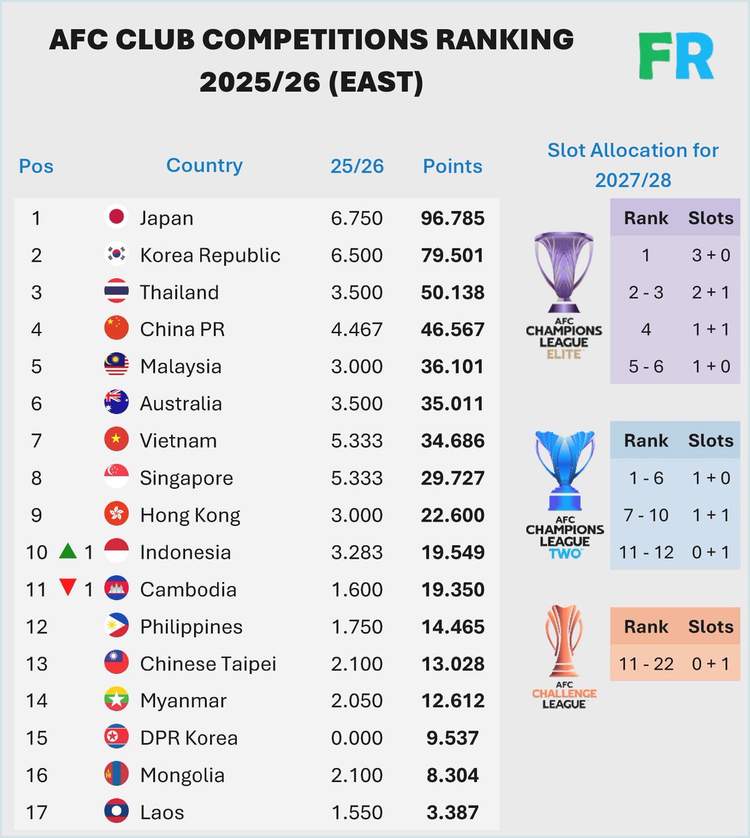 ◆悲報◆豪州Aリーグ、AFC東地区クラブカントリーランキングで中国・タイ・マレーシアにも抜かれて6位転落…日本はダントツの1位