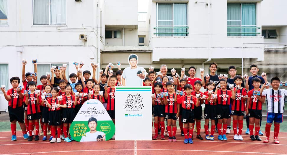 ファミリーマートが行う社会貢献活動「スマイルおむすびプロジェクト」の一環で12日、東京三育小サッカー部の子供たちに同社のおむすびと、アンバサダーを務めるドジャース・大谷からの手紙がサプライズで届けられた。