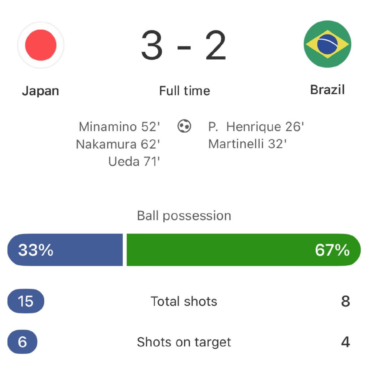 まさかの敗戦に、ブラジルメディアにも激震が走った。「O GLOBO」は「ブラジルが公式戦で初めて日本に敗れる」との見だしで速報し、「日本の勝利によりブラジルがアジアのチームに26年間無敗だった記録も途絶えた。最後にアジアチームに敗れたのは1999年、ソウルでの親善試合で韓国に0-1で敗れて以来だ」と歴史的な敗北を記録面から報じた。