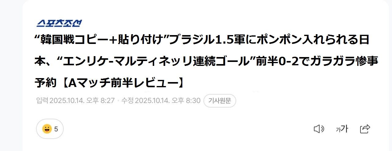 【日本代表】ブラジル戦前半が終わった時の韓国の速報記事がこちらw