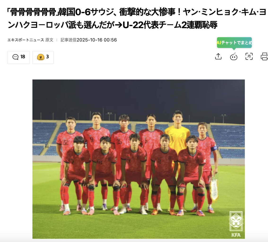 「ゴルゴルゴルゴルゴルゴル」韓国0-6サウジ、衝撃的な大惨事!ヤン・ミンヒョク、キム・ヨンハクらヨーロッパ派も選んだが→U-22代表チーム2連敗恥辱