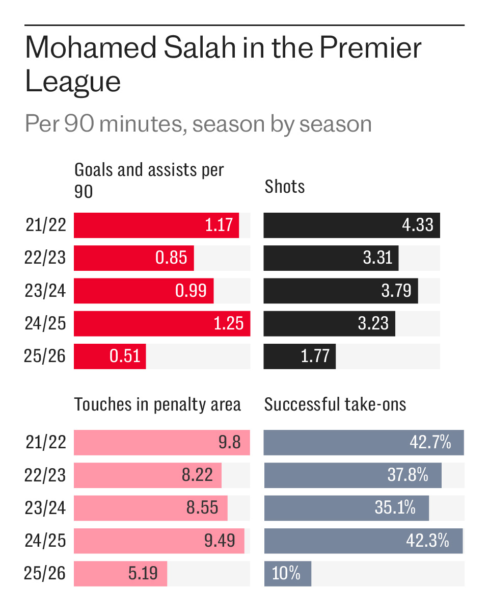 ◆悲報◆リバポFWサラー、衰える?GA数は半分、シュートも半分、ドリブル成功率は僅か10%