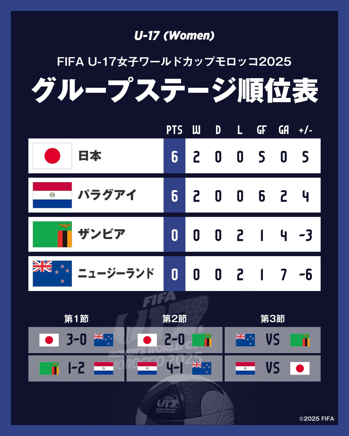 同41分にはMF福島望愛(JFAアカデミー福島)がPKを決めて2戦連続ゴールで追加点。守備ではザンビアを抑え、3-0で勝利した19日ニュージーランド戦に続くクリーンシートで決勝トーナメント進出を決めた。JFAの女子公式X(旧ツイッター)によると、プレーヤー・オブ・ザ・マッチ(POM)には須長が選ばれている。