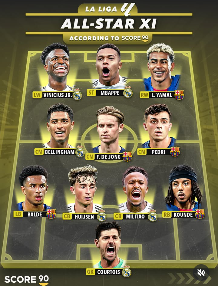 スペイン・ラ・リーガは、DFディーン・ハイセン(レアル・マドリード)、MFペドリ(バルセロナ)、そしてFWキリアン・エムバペやFWラミン・ヤマルなど、スペイン“2強”の選手のみでオールスターイレブンが構成されている。