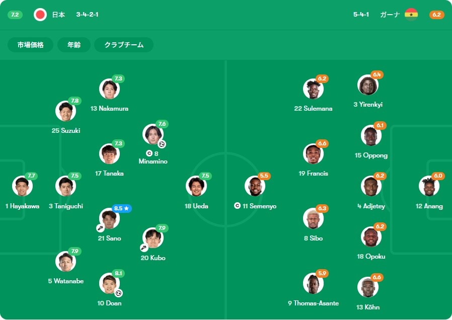 ◆親善試合◆ガーナ戦採点 最高点佐野海舟8.5、次点堂安律8.1、3番目久保建英と渡辺剛7.9