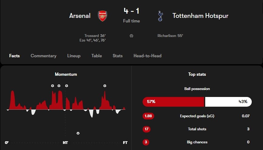 ◆悲報◆ノースロンドンダービーのスパーズさん、xG僅か0.07!リシャルリソン奇跡の1発のみ