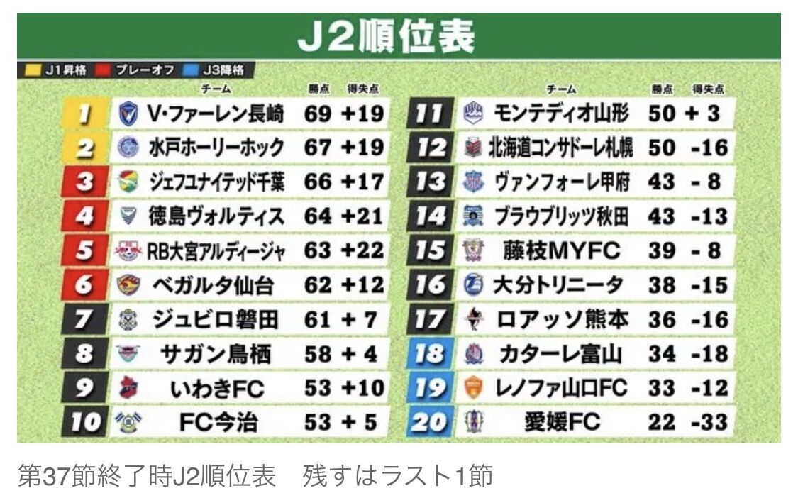 首位の長崎は引き分け以上で2位以内が確定。2位の水戸も勝てば自力で2位以内が決まります。それでも優位に立つ長崎は徳島との上位対決となっており、最終節まで上位陣の戦いが注目されます。